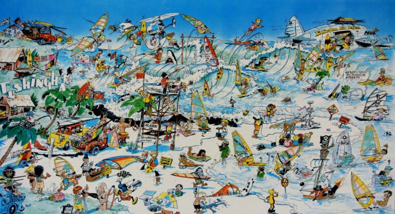 Your first thought is to work out where the wind is coming from. Look for local signs like flags or feel the wind blowing onto your face. Once you know the wind direction, you can then work out which direction you can windsurf in. Most windsurfers sail back and forth at 90 degrees to the wind. In sailing terms this is known as ‘beam reaching’ or sailing ‘across the wind’. Windsurfers always have their back to the wind so that they can lean back to oppose the power in the sail. So if you stand near the shoreline with your back facing directly to the wind and put your arms out to your side at 90 degrees to the wind, that will give you your approximate ‘beam reach sailing line to the left or right’.