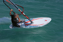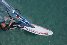Very good early planing and a nice easy cruising feel. It cuts through the chop nicely and feels light and lively in the water. It goes upwind easily and while not quite challenging the slalom leaders, holds a good top speed with little effort. It is comfortable through the bumpy stuff, and keeps control well in strong conditions. It feels nicely manoeuvrable at all times and gybes well for all levels.