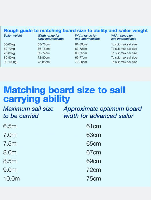 Late intermediate: Sailors who can cope with a wide range of conditions and are beginning to get some success with the carve gybe and develop an efficient stance. Advanced: Good stance, early planing technique, able to cope in waves and stay on the plane when gybing. Variables We have left quite a big range for each category of weight and ability. This is because every situation is different and the range should encompass those variations. A sailor may be fit or unfit, athletic or not and need to adjust board size accordingly. They may sail regularly, or only once a month during the season. Then there is location. If you sail in clean wind and flat salt water, like an estuary protected by flat land then you will require less board size than a sailor on an inland lake where the water is lower in density and the wind is likely to be gustier and on average lighter.