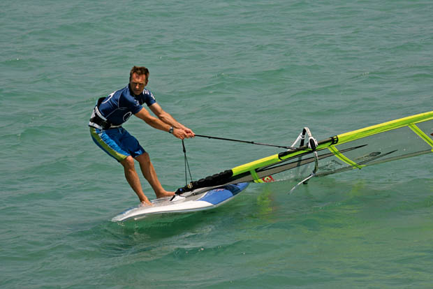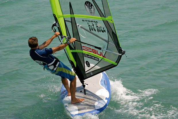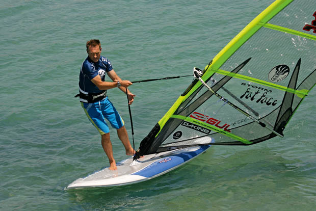 slightly, pushing through the feet to ensure the board heads more upwind than across the wind. This encourages the rig to be drawn forwards from the back of the board, which makes everything more stable and lighter when getting going.