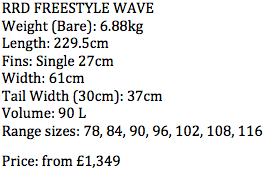 RRD chose to supply us with their 90 litre version, making it the smallest in test as they feel that the width was more comparable to the rest of the group. At 61cm wide it was in fact one of the wider boards, but the tail width was the second narrowest. It was also the second shortest in test.
