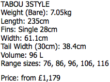 On paper, the Tabou is the biggest board in test at 96 litres. Both the max width and tail width are also both up there, beaten only marginally by the Starboard. It’s quite a radical shape actually with a stepped tail design and quite chunky rails compared with most of the other boards. The 3Style is designed as a single fin and is supplied with a 28cm version (one of the biggest in the group).