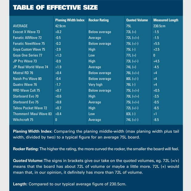 . In the Effective Size table, to take into account the factors mentioned above we have tried to give a more immediate comparison of planing width by looking at the planing middle-width of each board; the average of the tail width and max planing width (i.e. adding together the tail width – 30cm from tail – and max planing width of each board and dividing by two).You may think that a few mm either way doesn’t make much difference, but just 5mm is enough to make a noticeable difference between boards.We then show this as + or – compared to amedian figure, representing what is typically thought of as a 75L board (and pretty close to the middle of the spectrum of boards on test here).
