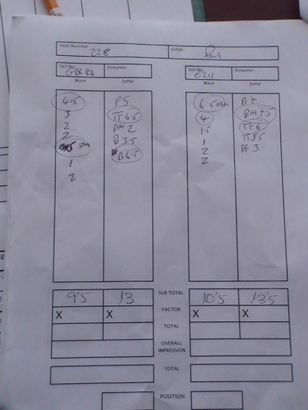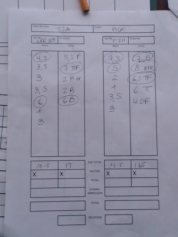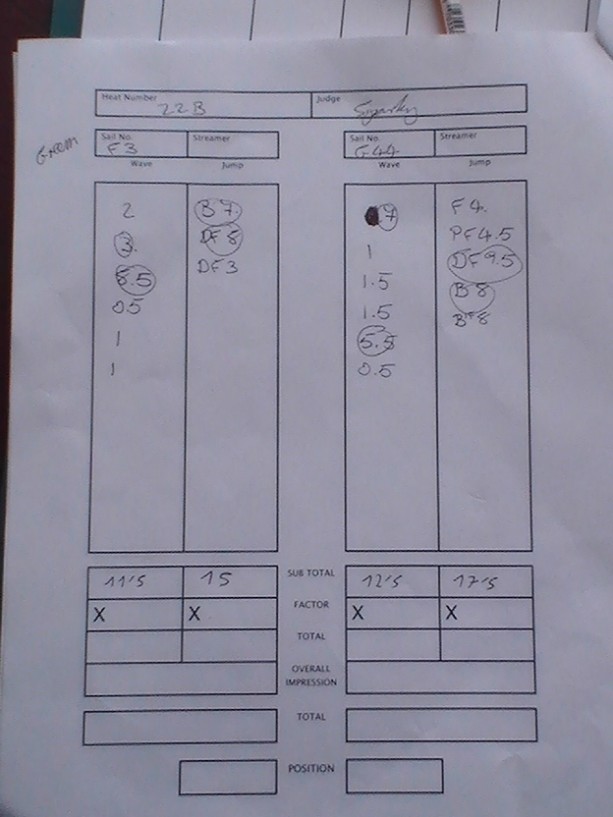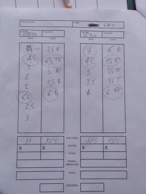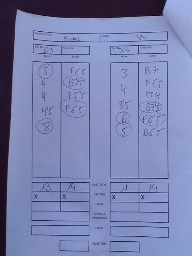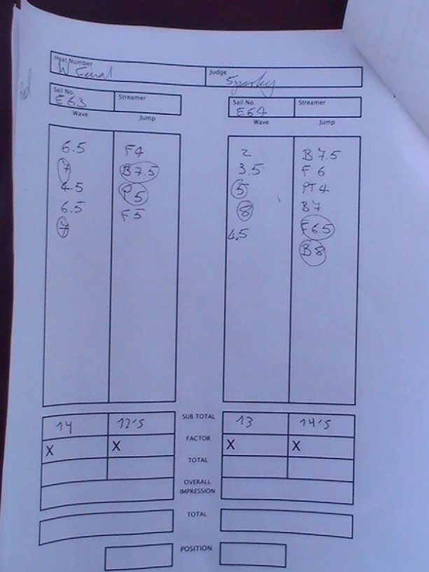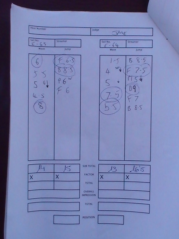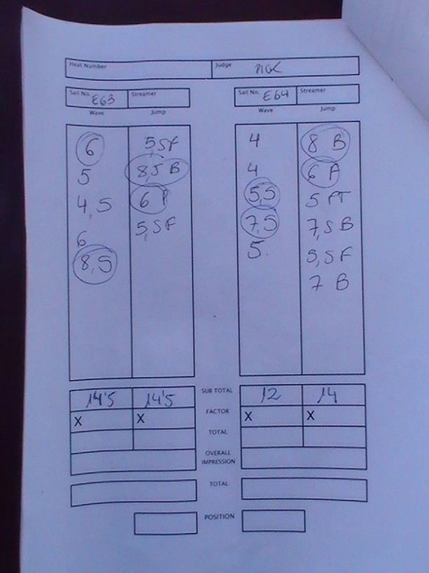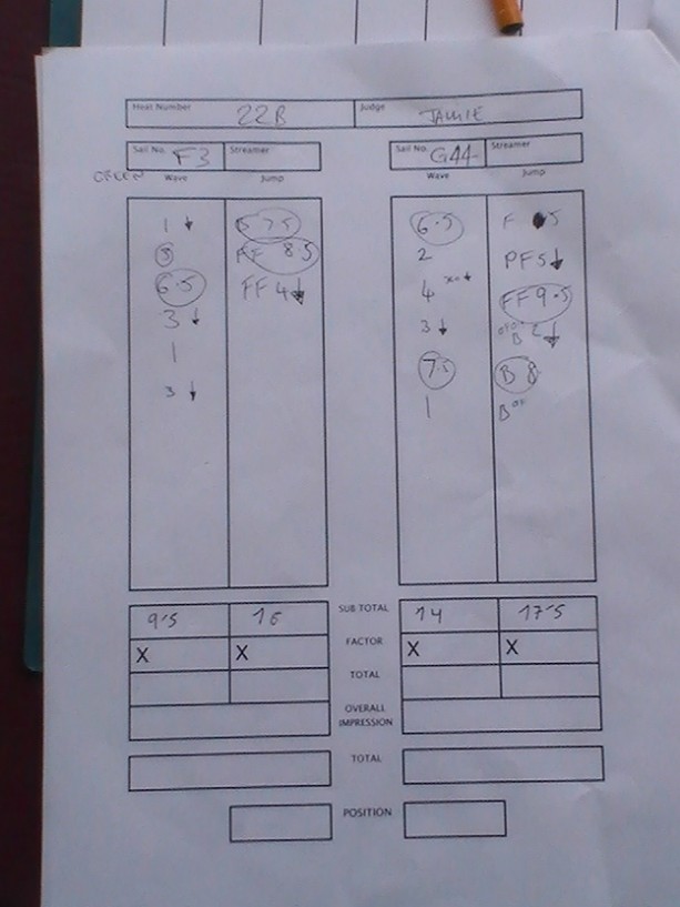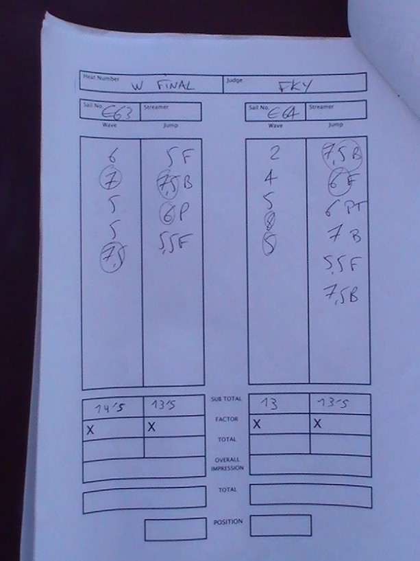 Score sheets from the women’s final, where Iballa takes the win over Daida in a 3-2 decision. Wave 360 right at the end took it for Iballa!
