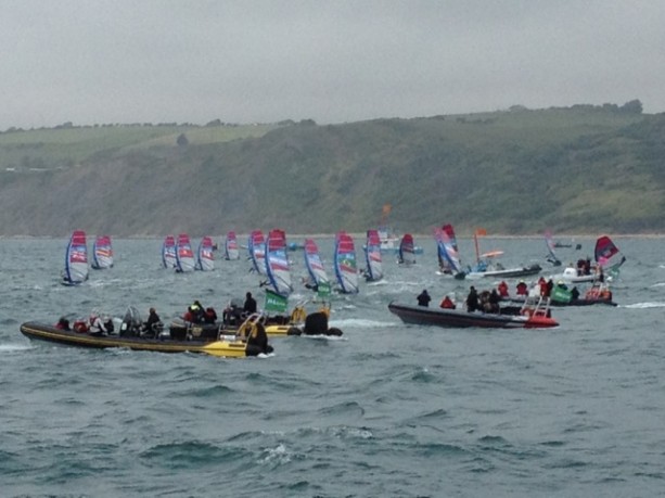 The RS:X women took to the water straight after the men, the bright pink limited edition Olympic sails reflecting the small amount of sunshine we had today.