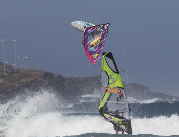 Many of the top men and women hit the water yesterday, in fairly light (4.2 – 4.5) winds. Koester was absent as he hasn’t arrived just yet, but among the stand outs were Campello and Brawzinho who were putting out the big jumps even in the fickle conditions. Gaastra/Tabou boys Mussolini and Traversa shone too with slick wave rides, making the most of the relatively small waves.