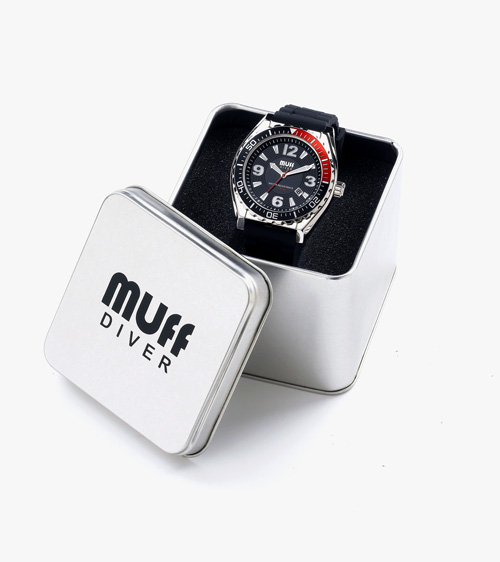 MUFF Diver watches feature a solid stainless steel case, soft rubber strap and original deep black textured dial with luminous hands. It is also water resistant up to 330 feet.