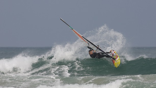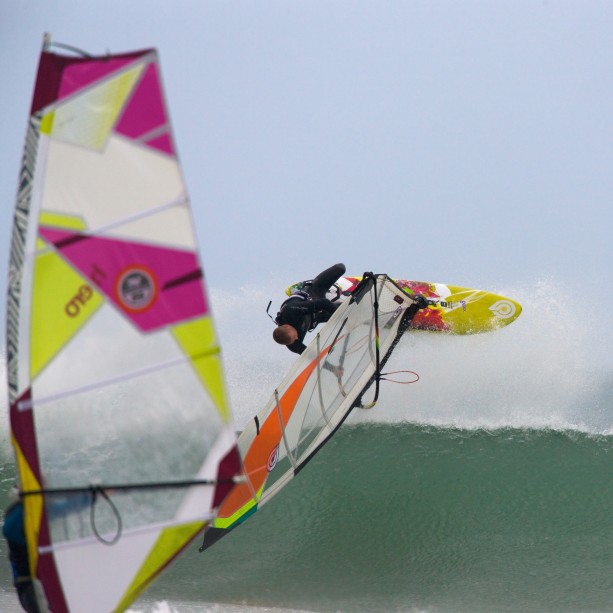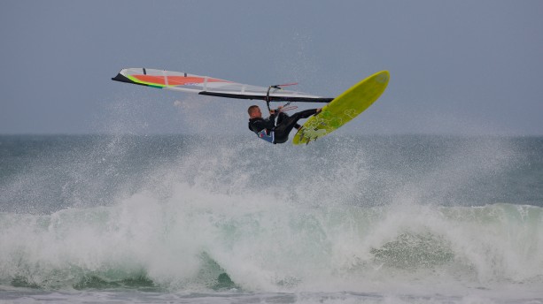 The fun continued for an hour or so until the tide dropped so low that the wave was breaking into about a foot of water.  Even with multi-fin boards you would finish the wave and have to jump off and run or get catapulted into the sand.  Given the last it was probably not the best idea to try a goiter off the end section of one of the set waves.  It was one of those times I approached the lip thinking this doesn’t seem like great idea but hey what the hell.  Spurred on by watching the wonder kids in Klitmoller I knew I needed to launch off the pitching lip to stand any chance of landing in front of the wave so that is what I did.   It is surprising how quickly you realise all is not good as the bottom of the wave dropped away so quick it slowed my board causing me to hesitate in throwing the rig which left me out of sorts contorted back to sail above the pit of a little ASBO of a wave breaking in a foot of of water.  Hoping the money shot was in the bag I braced myself for my punishment which I was expecting to be the usual where you land on the top of the sail and scrape your face across each batten whilst getting sand driven into every orifice.