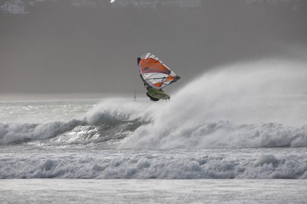 Having slid my way down the drop I was soon hitting the water with the conditions looking super fun. The sun was out, head high waves were marching in and the wind looked a solid 20 – 25knts side offshore. Fulling planning straight off the beach I felt the stress of work etc just blast away off my shoulders and as a back loop ramp walled up in front it of me I got the perfect way to let off some steam as I rocketed in to the sky watched by an audience of school kids ambling their way back up the beach.