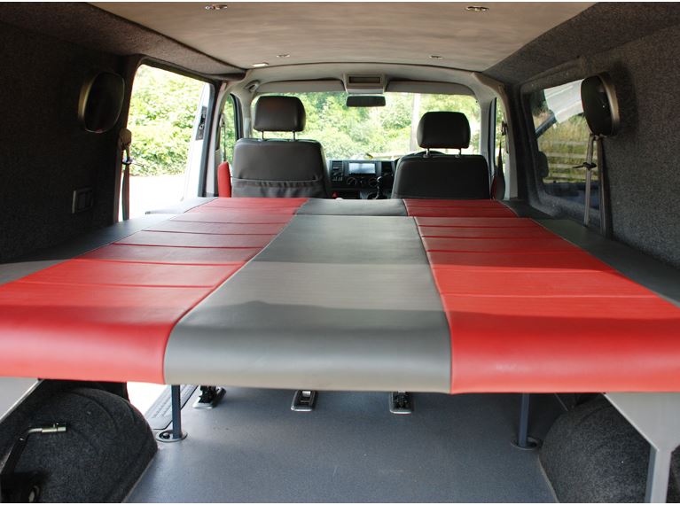 Kombi beds are designed to fit this remit, being easy to remove and able to store flat in a garage with ease. They don’t interfere with the existing rear seats (ie you can leave the rear seats in place), have massive storage underneath them for boards, bikes and other toys and can be upholstered in a variety of trims to either match your seat cloth or your personal tastes. They are super easy to fit, bolting directly onto the rear load points and our new design allows the ‘mattress’ to be removed separately, so the bed can be used also as a stowage shelf. Price – £725+VAT