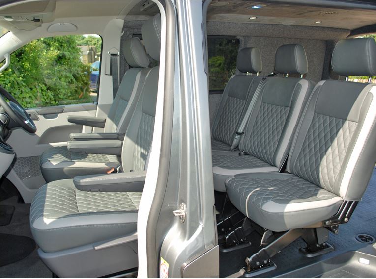 Re-trimming the seats in leather certainly gives the interior a much more plush appearance, but there are also a couple of functional advantages as well. If you are prone to dropping your lunch on your lap or have kids, then the leather wipes clean much easier than the regular velour. And if you like to sit on the seats in your wetsuit or wet clothes, then the leather is much less likely to soak water through. We can re-trim seats in a whole range of colours and styles. Price from £745 +VAT per row fully fitted