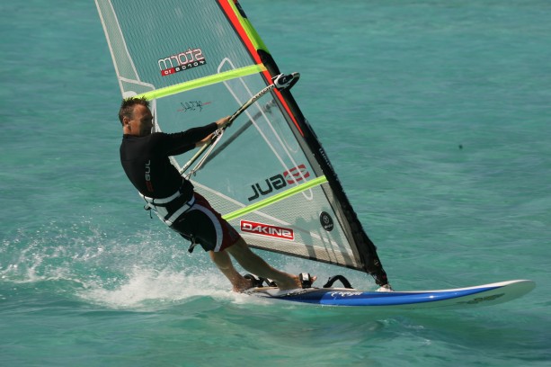 To keep planing through lulls or when heading upwind, lean the upper body forward and rake the sail back towards the tail to counter balance.  In extreme situations this can mean bending the front leg slightly to allow the upper body to accentuate the forward lean.