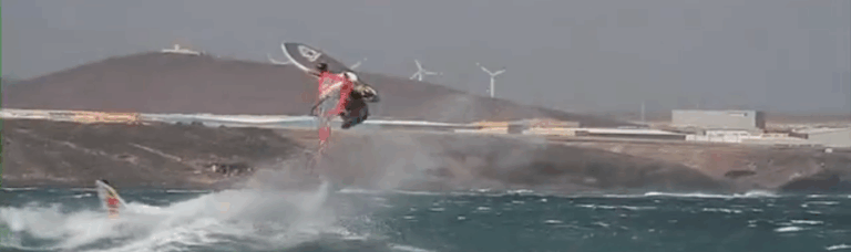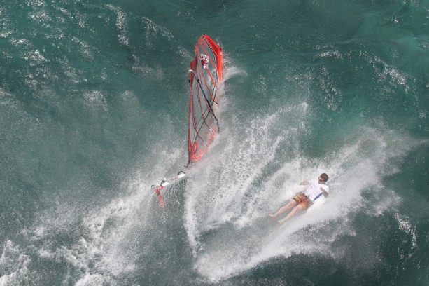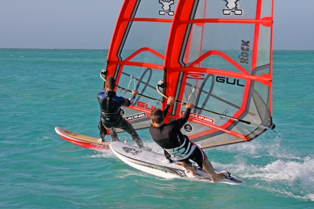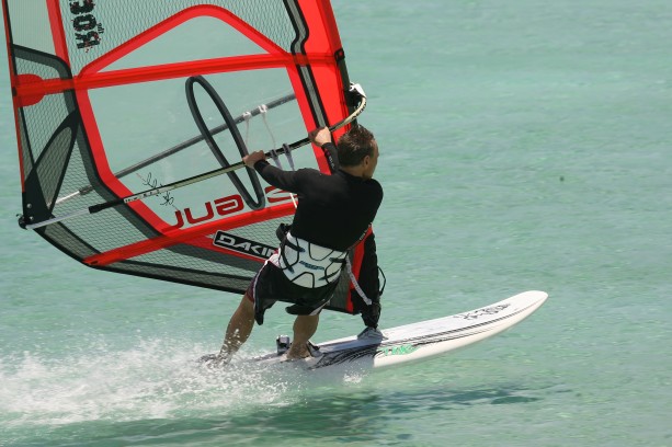 Strong winds, need real commitment and the rewards are amazing. So whenever windsurfers need more control they use what is often referred to as a Super 7 ‘drop and dig’ stance. This action is used whenever there is a very strong pull from the rig, be that getting going, harnessing, finding footstraps or controlling a speeding board over chop. The principle movement is to ‘drop’ the hips and ‘dig’ the heels (curling the toes up when in the footstraps). This dropping down and back in the harness increases your resistance over the rig and creates a down force onto the mast base that helps lock the board flat. The curling of the toes and the crucial flexing of the back leg absorbs chop and reduces bounce. When it’s windy, you’ll see people locked down and really blasting flat out. No words can describe the sensation this gives you.