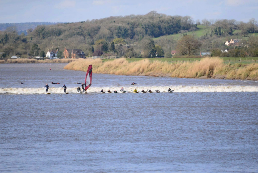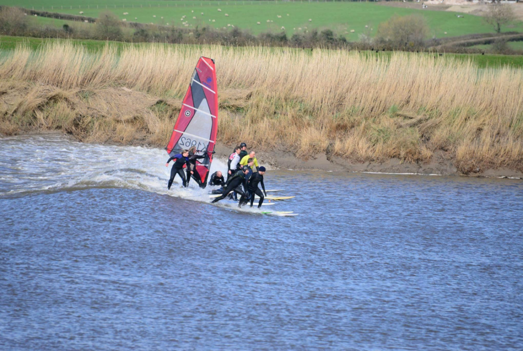 I was slowly sandwiched in between about 20 surfers, because the wave had come around a corner the wind in my sail was straight on the nose of the board and I had to stand on the mast foot with the sail totally feathered to stop being taken over the back of the wave . Everyone riding along at walking pace it was very surreal. people were shouting to move right and we moved across. Then it started to fizzle out and I could see surfers dropping off the wave. As the wave approached the next corner the wave started to fade in the middle and surfers were trying to move to the inside to stay on the peak at this point the wave was gone for me, I looked back and could see there was a reform behind the main wave and figured if I caught it I would be able to get to the peak again. I rose up the face and was about to take the drop when a surfer dropped off the main wave in front of me and we collided. I went over the handlebars and rose to a torrent of abuse… I apologised to the guy, it’s never good to crash and the poor chap had taken quite a thump. The surfers carried on surfing the bore and I was left to try and get back to the upwind bank which was another mission of swimming I ended up about a quarter of a mile upstream from where I had started so I had a bit of a walk with my kit to get back to my van, I had a chat with a few surfers who said they were very dubious when they first saw me get in and thought some clown was going to take them all out, but once they saw me come round the corner on my own on the peak they were a lot happier. I tried to find the guy who I had collided with but he had left. I got in contact later and he said his arm was badly bruised I apologised again and he was cool.