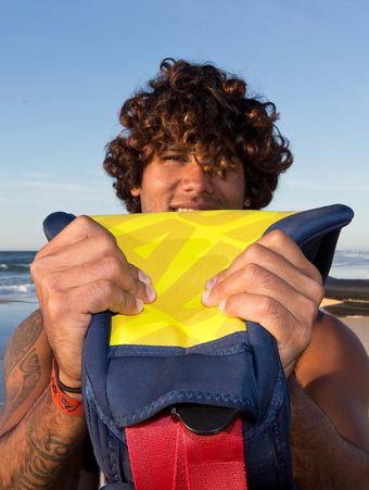 Gollito takes off his harness and shows us the materials on the inside. His Maddoxx is solely made up of laminated neoprene, which allows the harness to slide around the body. Gollito adds “That’s so awesome when the harness slides around, in particular for tricks that require riding switch stance for longer periods; it totally helps to still maintain a comfortable, relaxed stance and body position.