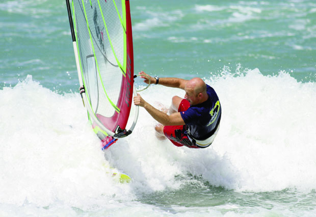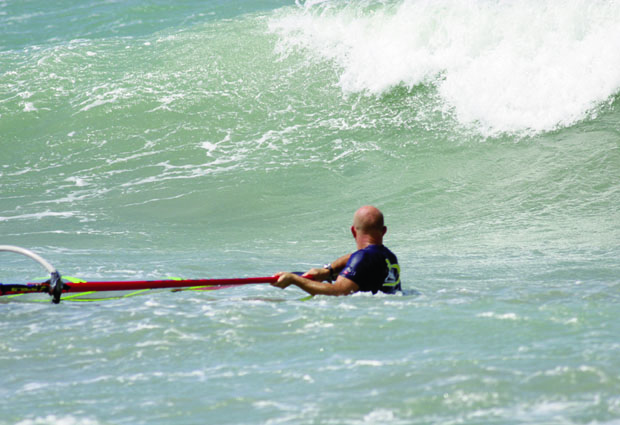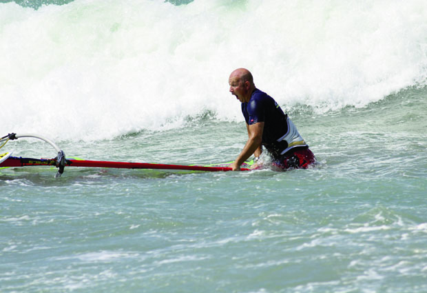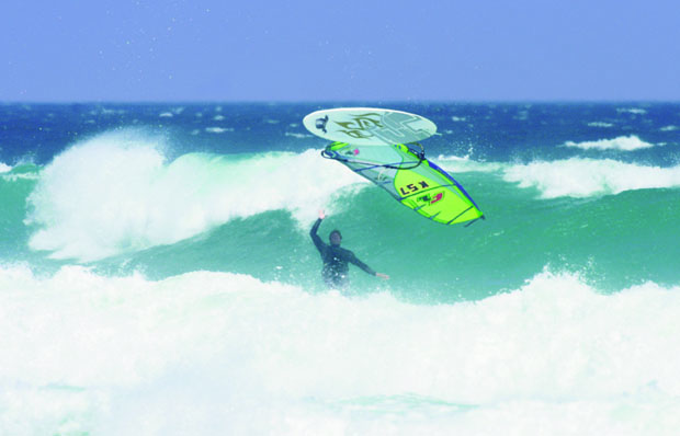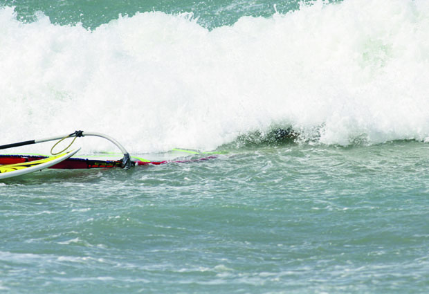 Before going any further though, let’s just get something clear. Getting rinsed doesn’t hurt! It’s fun. OK, yes, if you’re getting washed over a neardry reef then that’s not fun. If you’re getting held down for two minutes at Jaws, that’s not fun. But in the sort of waves that beginner to intermediate wavesailors are out in, you’re not going to come to any harm at all. I’ve seen people pack up and go home after one decent rinse-and-swimashore; they really thought they had suffered something devastating. Yet actually, if they’d watched for a while, they’d have seen loads of people taking a rinsing but not thinking twice about it. They stayed relaxed, reunited themselves with their kit, and carried on sailing. It will happen to you, and it’s nothing to worry about. (Assuming you can swim. If you can’t, then wavesailing perhaps isn’t your ideal choice of pastime.) So, nothing to worry about – OK? But there is certainly plenty you can do to minimise the effects, and the energy outlay, of getting rinsed. All through this series I’ve emphasised the importance of having a gameplan. Prevention is definitely better than cure here! For example, if you’re getting savaged every time you try to get out and winning more awards for swimming than jumping, it’s probably time to reassess your tactics: • Are you on the right kit?