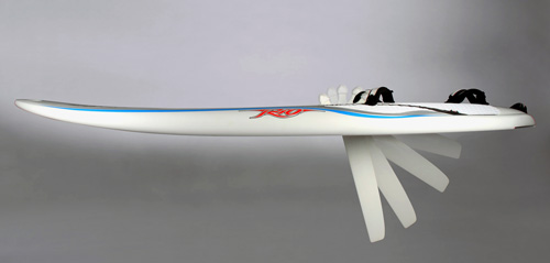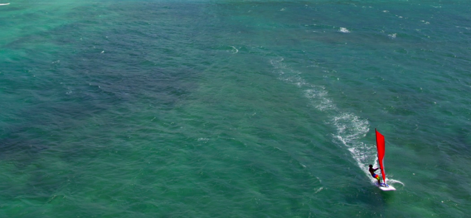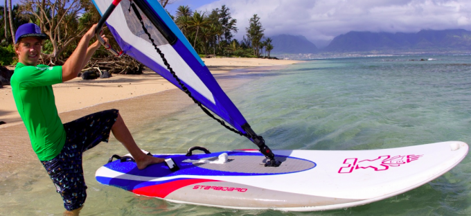 Most beginner boards have retractable daggerboards which, when down, give greater lateral resistance, stability, and aid staying upwind in light wind, ‘non-planing’ situations. The daggerboard is retracted into the hull when the board is sailed over the water at ‘planing’ speeds. The alternative is a fixed centre-fin that bolts onto the underside of the board and can be removed with a screwdriver for stronger winds. Given a choice between the two, I’d recommend a retractable daggerboard – especially if you sail inland.