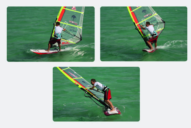 How? Broad reach fast into a gybe, unhook, place the back foot across, and really sheet in with the back hand to make the rig ‘go light’. Continue to massively over-sheet the rig, but then lay the rig down low and back. To counterbalance, lean the upper body forward into the turn. Don’t hold it for long, and raise the rig by scooping it forwards (body goes back) and be ready for a very fast dynamic, speedy foot and rig change: