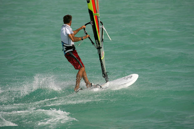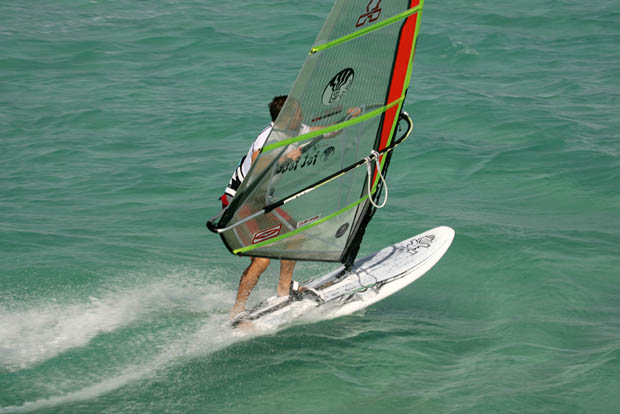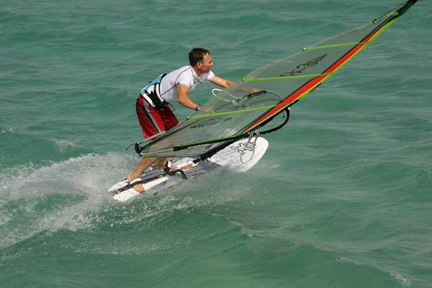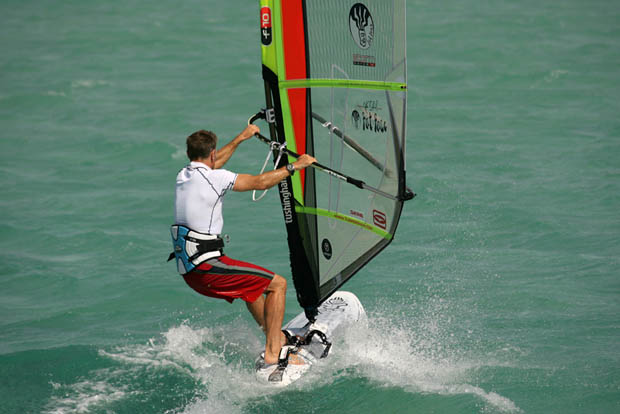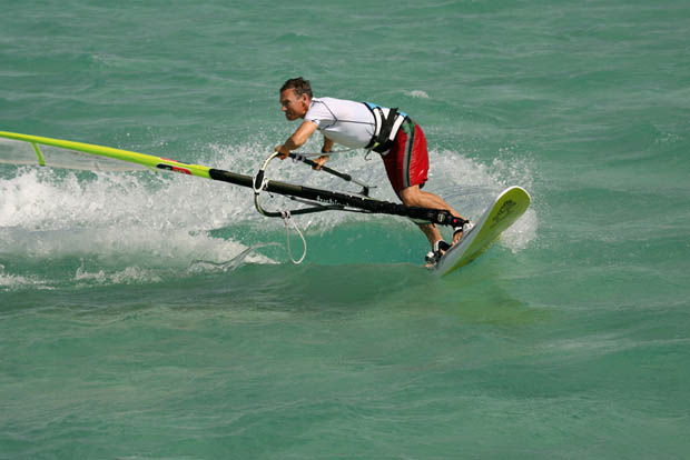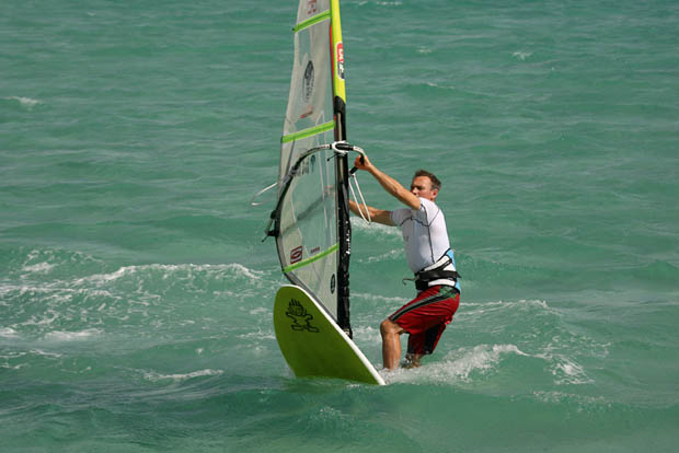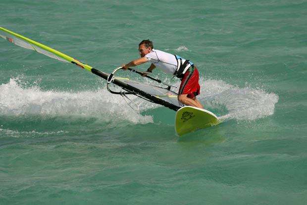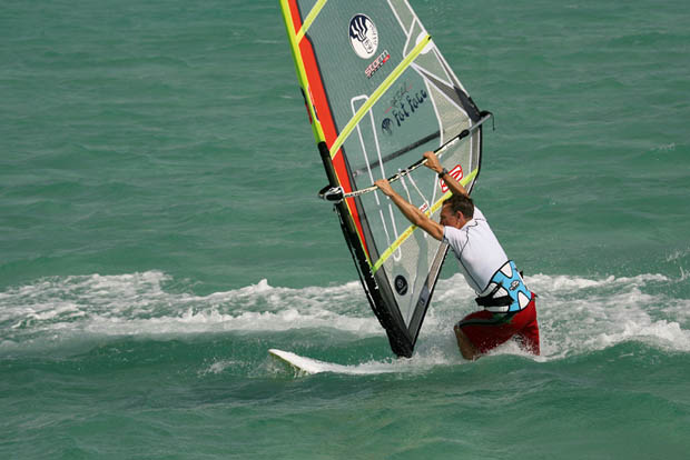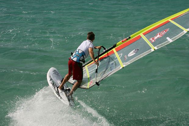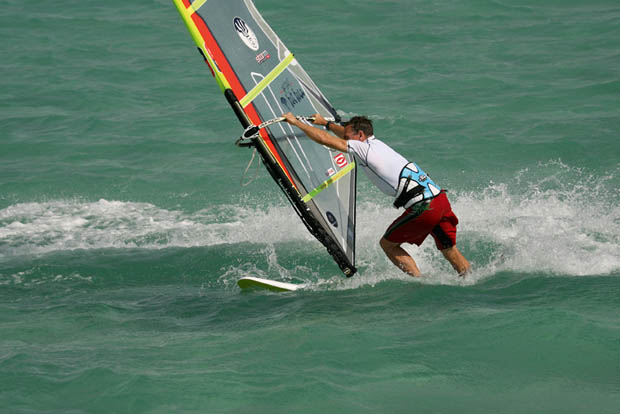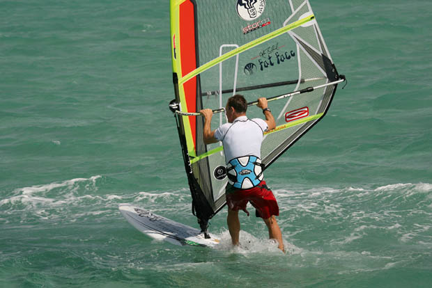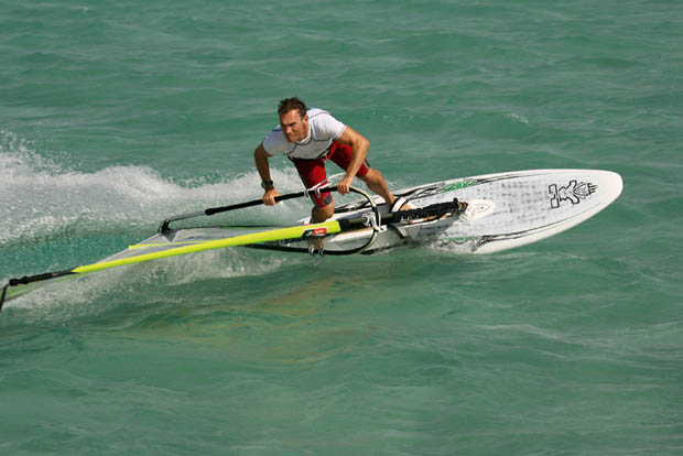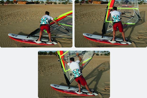 How? Head upwind, as if tacking, but adopt a wide foot spread. Turn until ‘front-to-sail’ – rig back / body forward, then whip the mast forward and push the mast very low with the front arm. Flex the knees and keep the boom as horizontal as you can with the clew over the board. To recover the sail, the ‘trick’ is to push out on the back hand and slide the mast forward and up with the front hand. Get the rig forward otherwise you just get thrown off the back. As the rig rises, sheet in hard with the back hand: