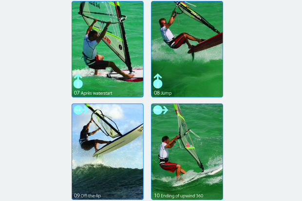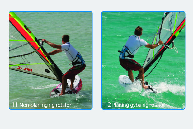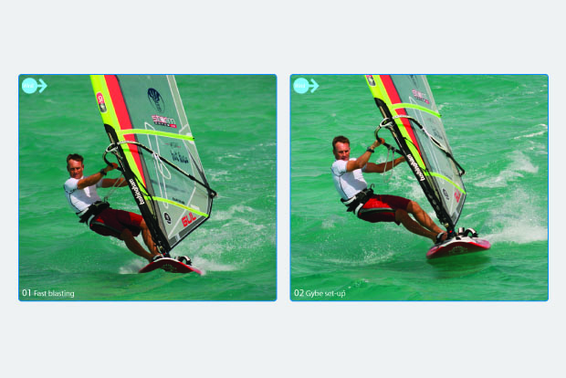 These two shots show how similar the body position is when rotating a rig, be that a full planing carve gybe or a non-planing situation (e.g. non-planing gybe, clew-first beachstart or helicopter tack). You’ll soon be far more aware of how and why the body needs to be angled, directed and trained for all aspects of a transition: