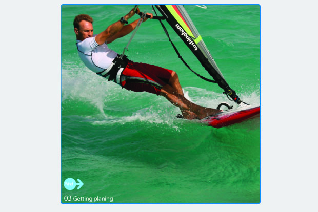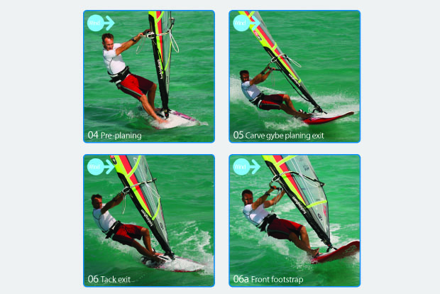 However, there is a slight difference in how the forces are directed through the front foot. In the fast blasting and gybe setup shots (pix 1 & 2) I’m using a Super-7 ‘drop (hips) and dig (heels)’ stance to lock the board flat for maximum control at speed. In the remaining pix I’m using a Super-7 stance, dropping the hips down, but this time pushing through the front leg and especially the toes of the front foot to drive the board forward. (For the front footstrap shot, I was pushing through the toes, but I’m just moving my foot into the strap.)