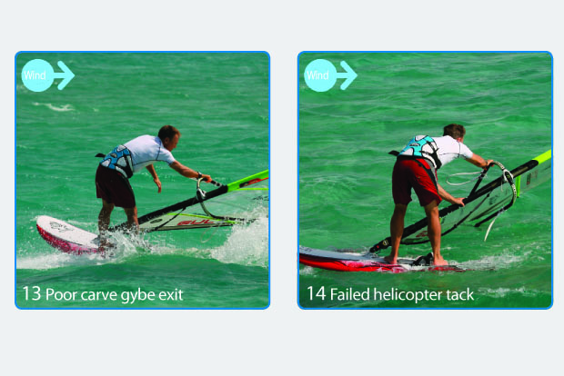 These two shots illustrate the common body position that leads to a dismount and loss of control of the rig. These are actually quite close to the gybe stances, but they always end in failure. This is primarily down to the fact that you can flex at the waist in windsurfing in certain situations IF you also bend your knees. But if you flex at the waist and straighten the legs it almost invariably leads to a dismount: