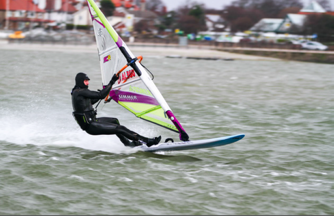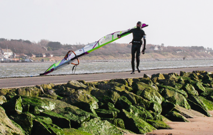 So now I find I’m stood waist deep in brown water in West Kirby, about to do my first speed run, on a Monday morning in February. Despite a wetsuit numbing the senses, I can still feel my booted ankles deep in mud and icy splashes of water and wind chill sneaking through my palm-less mittens. My back is leaning against the West Kirby sea wall and I’m doing my best to hang on to the luff tube of my sail. It’s solid 4.0m fun sailing conditions and I’m holding onto a 5.5m. Not just any 5.5m though, this is the set-up of the UK’s fastest man: Farrel O’Shea.