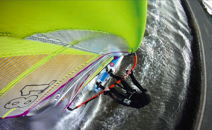 So with a numb set of hands and absolutely no idea what the next minute or so was going to entail, I waterstart up onto the board, hook into the harness and wiggle my muddy, booted feet into the straps. Straight away I am surprised at how easy the bigger Mistral is to sail. It feels very similar to sailing a slalom board and is no problem really to get going on. I am fully lit on the 5.5m, as I try to sail as tight as I can towards the wall. To keep everything planted, my shoulders are inboard, my legs slightly bent and I’m pushing out on my waist harness. It’s not the fastest technique but it’s keeping everything locked down ready for the start of the run. As it’s my first run, I am a bit conservative in how close I get to the wall before I bear off. With so much power in the rig, it takes a fair bit of technique to bear off the wind and knowing that if you get it wrong you are going to pile straight into the concrete wall, definitely keeps the attention! The acceleration is incredible! I have never felt anything like it on a windsurfer before. It’s like being slingshot and to be honest was probably the most memorable part of the whole course for me!