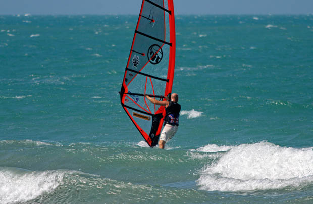 7. Come up and get the sail more open with the rig forward and ready to power up. Flatten the board by pushing down on your toes and scissoring it off downwind. Now tell me that did not feel amazing! So go on and do some more and get them cleaner and faster:
