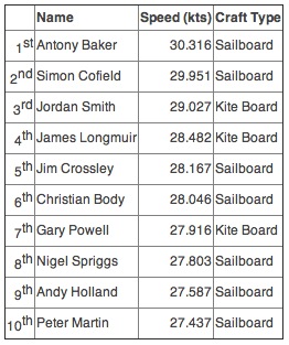 It’s Ant Baker that is currently occupying the top spot, managing to get over 30 knots in the light winds, but Si Cofield and friends are hot on his heels. We hope that the wind will materialise later in the week to really test all the riders.