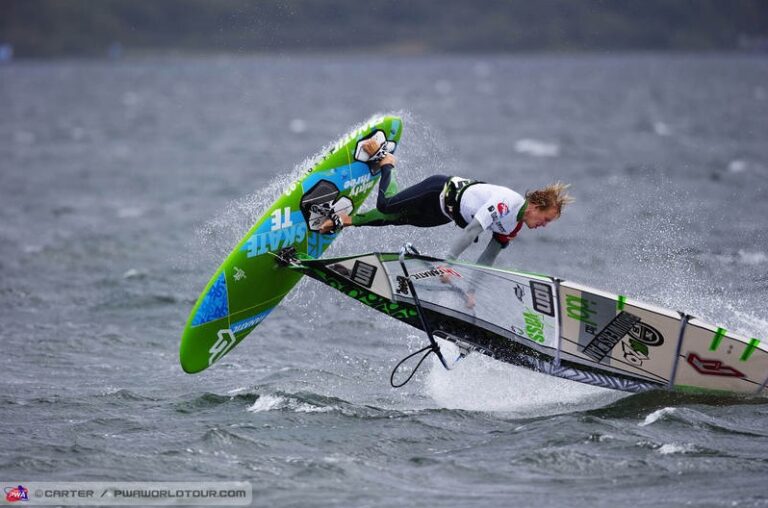 There’s a strong contingent of British riders at the event with Lizzie Smith taking on her first PWA event, and the familiar faces of Chambers, Sims and Rowe competing in the men’s event. After the single elimination Rowe and Chambers are both within the top 10, in a tied 9th position, whilst Sims is will be hoping to come back strongly through the double.