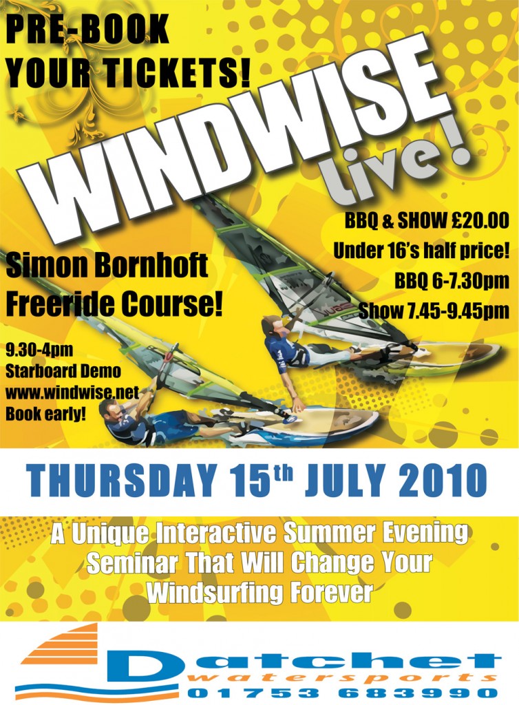 Datchet Watersports are bringing Simon Bornhoft to their West London windsurfing venue on Thursday 15th July 2010. There are limited spaces on Simon’s coaching clinic during the day. A day of expert coaching for only £99! In the evening he’ll be putting on his renowned “WindWise Live” interactive windsurfing show… If you didn’t make it to one of the shows last year, then make sure you don’t miss this opportunity!! Tickets can be reserved through Datchet Watersports and are £20 to include a sumptuous bbq (under 16s half price). There will also be some Starboard and Tushingham Demo kit to try… so give us a ring on 01753 683990!