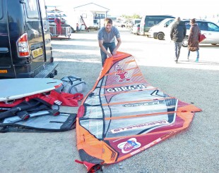 The second race is delayed and run over only one 20km lap. I take a R4 6.2m/iS87/Vector Volt 34 combination and am right up there until about 4km from home when I suddenly lose speed and start to struggle to point upwind. People start to overtake me and I fear that I will not make the finish line. About 10 metres from the line I have to unhook and pump and just bounce off the downwind finish buoy and over the line. On the beach I discover that the fin head has cracked and the fin has been leaning over in the box. I am lucky to have finished in 23rd but the need to find a replacement fin is to have negative consequences on the following days. Sebastien Bonhomme Allaire leads overnight and I am 14th overall.