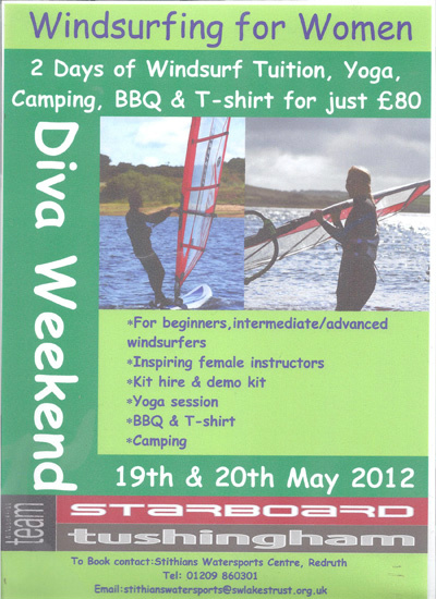 Windsurfing tends to be a male dominated sport but more and more women are getting into it, particularly through the Team 15 and junior clubs. Here at Stithians we are really keen to encourage a more even balance of genders out on the water. Here is a chance for women to learn or improve their windsurfing in a less competitive, nurturing environment with three female instructors. Diva 2012 is a motivating and inspirational weekend for women windsurfers, suitable for complete beginners through to advanced, offering women the chance to learn new techniques, share experiences and gain inspiration from female instructors.