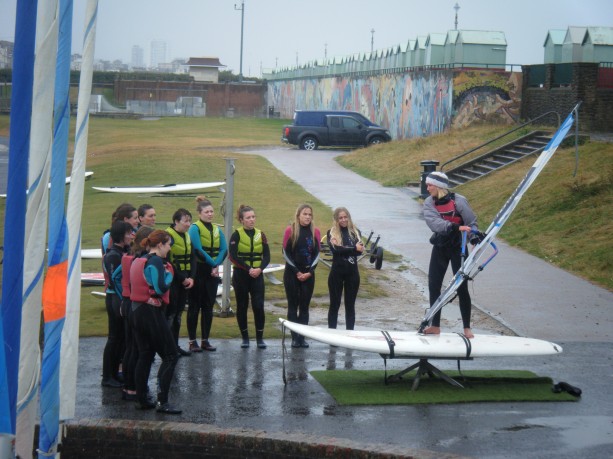 After registering in the comfort of the club house the 35 women ventured outside for a very energetic warm up with coach Lucy before hitting the water for windsurfing and SUP lessons on the lagoon, which provided a great amount of shelter from the ferocious weather.