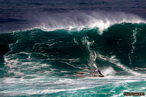 Thomas Traversa also tried to follow his fellow countryman Yannick Anton and had a hard fight for at least 40 minutes before he found a way to make it through the massive white water walls. Once Thomas was out he made the fault to sail too much downwind and not enough out on the open ocean. A huge wave caught him and finished his dreams to get turns done in the double mast high monsters. He made not one single turn in the end, but crashed his rigg completely! Broken mast, broken boom, completely destroyed sail. The jet ski rider, who made a great job at Puertito, saved Thomas and brought him back.