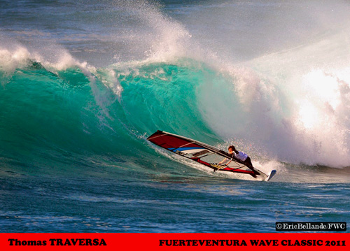 The seventh day of the Fuerte Wave Classic welcomed the riders with dark heavy clouds in the early morning. Nobody thought that any action could happen later that day. But the sun broke through and at 14.00, while the third skippers meeting of the day, Orlando Lavandera announced that all competitors should drive to Cotillo. Thomas Traversa were already riding the mast-high waves there in very light wind conditions. He had already scored three good waverides, when the rest of the troop arrived at Puertito.