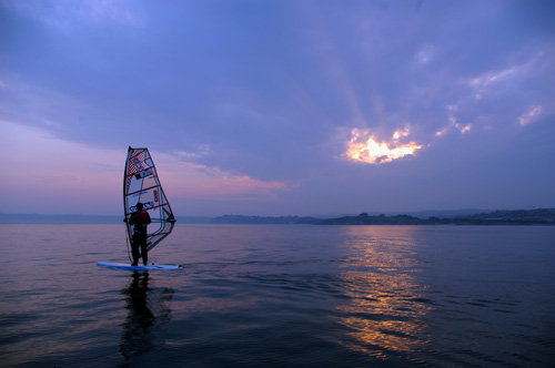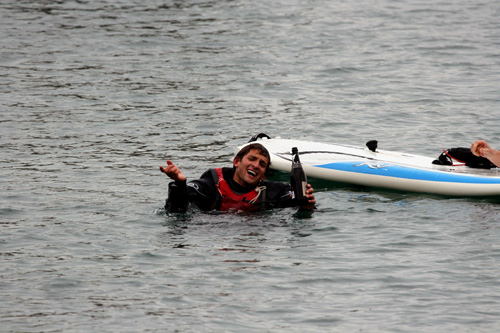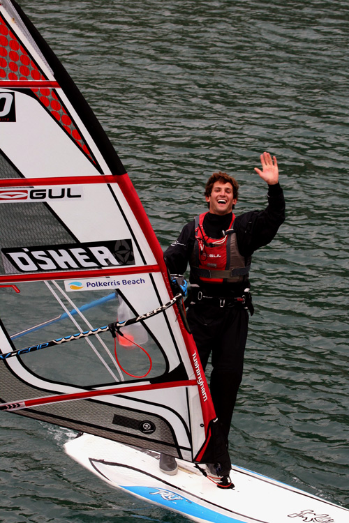 With only two 5 minute breaks on shore in the entire period, George windsurfed continuously, covering an estimated total of well over 100 miles. The steady Easterly breeze overnight was helpful but dawn brought a difficult windless period with choppy seas, followed by vicious squalls with winds of up to 20 knots and a thunderstorm. George said “the part from dawn until 8am was worst. The conditions were really hard, my back was killing me and I felt more alone than I did in the night. And I still had ten hours to go.”