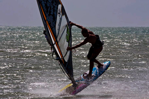Fresh from competing in the bizarre weather conditions offered up by the weather gods for the PWA Podersdorf freestyle event, Jamie Drummond (K-787) is now based with Ocean Elements in Vassiliki Bay. His next comp is at Milos Beach, which is just on the other side of Lefkas from Vass, so it’s a nice short haul this time.