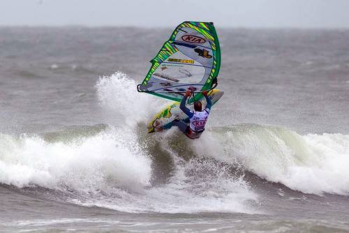 The former world champion, Kevin Pritchard (Starboard, Gaastra, Dakine) ended the day on high with his best result in waves for over a year. He nailed his trademark one footed backloops time after time, and racked up the points by milking the waves for all their worth. After a tiring day, he couldn’t understand how he’d advanced so far, commenting that his wave riding was so boring that anyone he beat should be ashamed! All jokes aside it’s an awesome result for the American, who after almost twenty years on tour is still smacking lips with the best of them!
