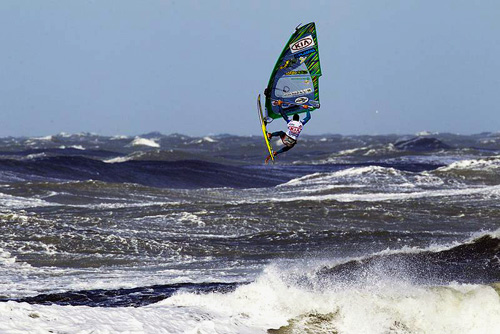 As soon as the riders in the first heat hit the water it was all too obvious that the double forward was no longer king. Within thirty seconds of stepping on his board, Britain’s Robby Swift (JP, NeilPryde) hit a perfect ramp and spun round the highest pushloop forward the judges had ever seen. With twelve points in the bag, Swift could’ve spent the rest of his heat watching his peers destroy themselves, but instead he carried on in search of another, only to hit his head and return to the beach requiring medical attention!