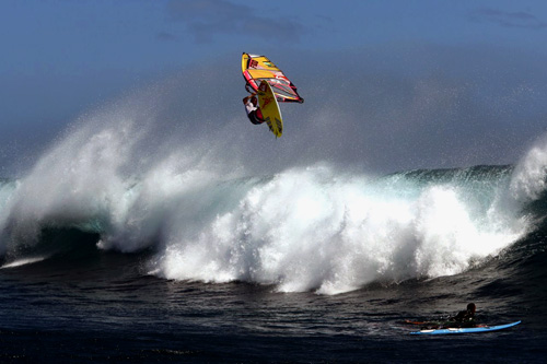 At noon, the wind was blowing at a good 30/35 knots outside in the bay. With 8 to 10 feet hollow waves very technical to ride, the timing had an important part in the sailing today. As he had a perfect timing, an excellent wave choice, very high and smooth aerials perfectly landed in the pocket of the wave, Sifferlen wins ahead of Jules Denel who showed an excellent potential with power turns and a good wave work. Unlucky again, Leon Jamaer rips his sail 10 minutes before the end of the heat.