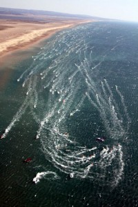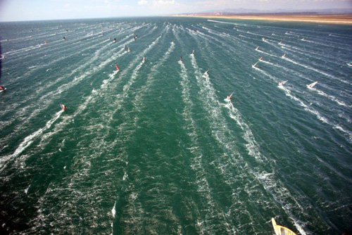 Race two was the stuff of legend… An hour before the race, the committee announced that the wind was averaging 45knts out on the course. I don’t know what it was gusting down towards the outside gybe but it must have been pretty special down there. That was it for Tris, Roger, Lalo, and I. We decided that it was time to become spectators and take in the carnage. We expected only a few German beefcake nutters to go out but to our utter horror, there must have been the best part of 300 competitors still willing to compete in these conditions. I never knew that so many 4.5 meter race sails and speed boards existed in the world. But exist they did and out went the loony few (relatively speaking) to give it a shot. The race crew decided to shorten the course to just one lap (a mere 20kms) which I thought was fairly understandable given the conditions. I can honestly say that I have never seen such a fast race as race two this afternoon… Some of the biggest guys (100kg+) were holding down 5.0 race sails on mirror flat water and they must have been traveling close to 40knts at times. Race two was finally won by Pascal Toselli racing on Point 7 sails and Mistral boards. I’d never heard of this guy before this event but he won by such a massive distance that we all thought that there must have been some kind of mistake. Credit must also go to Victor Fernandez of PWA wave tour fame who finished within the top 20 on a very small looking North wave sail.