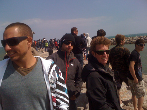 Team OTC's Lalo, Tris, and Roger take in the mega-windy action of Race 2 from the safety of the rocks