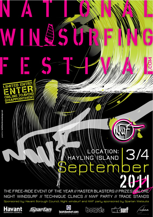 The biggest windsurfing event in the country The National Windsurfing Festival (NWF) comes home to the shores of Hayling Island once more on 3-4 Sept 2011 with a slight twist, as we will also be conducting a National SUP Festival (NSUPF) along side the event. We are also pleased to announce the event sponsors Havant Borough Council and Spartan wetsuits who will sponsor the Night Windsurf/SUP competition and the now legendary NWF VIP Hawaiian themed party. We will also witness the return of The Heathrow Jets playing the night away. The simple master blaster format encouraging all abilities so popular with the freeride community will witness a maximum of 350 competitors sponsored by the windsurfing industry. With the UK’s best windsurfing guru’s on hand conducting clinics throughout the weekend. Online entry starts 1 June 2011 with the first 250 competitors securing their festival rashvests and no price increase. The NWF hosts the largest windsurfing trade show with their new 2012 collections. This is the one event which witnesses the whole windsurfing industry coming together in support of our NWF freeride community to ensure you have an festival to remember. More info entry and additional party tickets can be found at www.nationalwindsurfingfestival.com