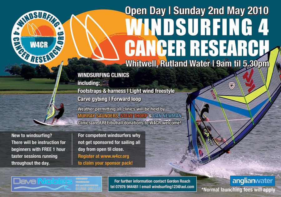 Doubtless plenty more announcements of plenty more Sunrise to Sunset charity events coming soon. But, complementing the headline Hayling Island event, here’s news of a Rutland open day / sponsored windsurf. This particular National Windsurfing Week extravaganza will also include free beginners’ taster sessions, plus clinics with Murray Saunders, Steve Thorp and Dan Newman . Click www.w4cr.org for a full list of national Cancer Research events, and www.nationalwindsurfingweek.org to find out what else is happening during National Windsurfing Week.