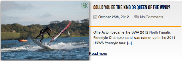 He is currently a student at Southampton Solent University where he has helped to set up and run the windsurf team there. Although they are a small team they have been doing very well at the SWA events since the teams inception. In the 2011-2012 season Ollie was crowned the student freestyle champion and won BUCS Gold in the mens team racing along with fellow Tushingham rider Sam Sills and Adam ‘Chubbsy’ Chubbock.