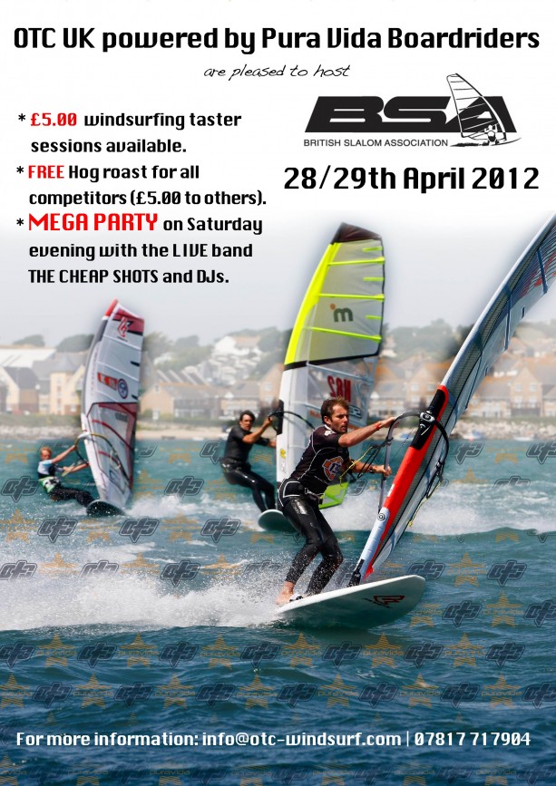 On the 28th and 29th of April, the British Slalom Association (BSA) roll into Weymouth town and park up on the doorstep of the windsurfing centre in the grounds of the WPNSA – the Official Test Centre (OTC). The centre has gone through a fantastic rejuvenation over the winter with the collaboration of Puravida Boardriders, a retail outlet from South Wales, to bring the very latest 2012 kit from all the major brands to fingertips of the centre’s clients. To celebrate the joint venture, the weekend’s event doubles up as a the centre’s main open day, with £5.00 taster sessions available throughout the weekend and a FREE hog roast for all the BSA competitors on Saturday evening (£5.00 to all others). Fully fuelled, everyone at the event will then be welcomed to a massive party in the Academy’s hangar, with DJs mixing in between the sets of the live band – The Cheap Shots – a reputed local band covering popular anthems. Wind permitting there will be racing throughout the weekend, for the Master Blasters, Amateur and Pro Fleets, yet plenty of other activities will be organised should the wind not materialise. One thing is for sure, it is a weekend not to be missed!