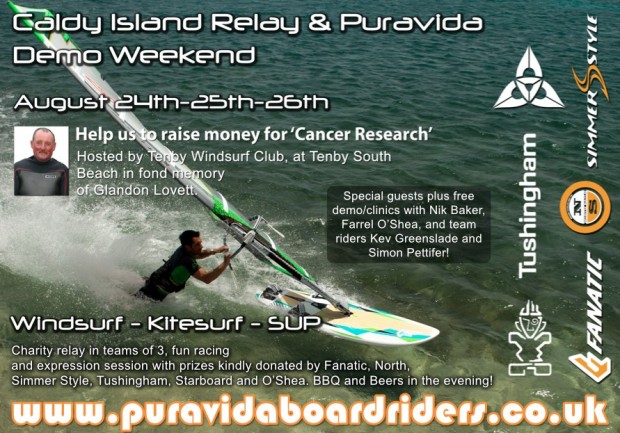 The Puravida Tenby Caldy Island Relay & Demo Weekend will take place from the 24th – 26th August 2013.  Windsurfing has been buzzing again this last few weeks with some wind at last and the excitement is building as Puravida Boardriders prepare for the biggest local water sports event in Wales this year!!