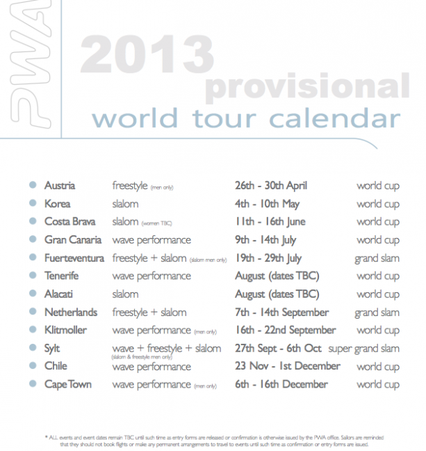 The PWA have released their 2013 provisional calendar, which is proving especially exciting for the wave sailors amongst us with two new wave performance competition venues.